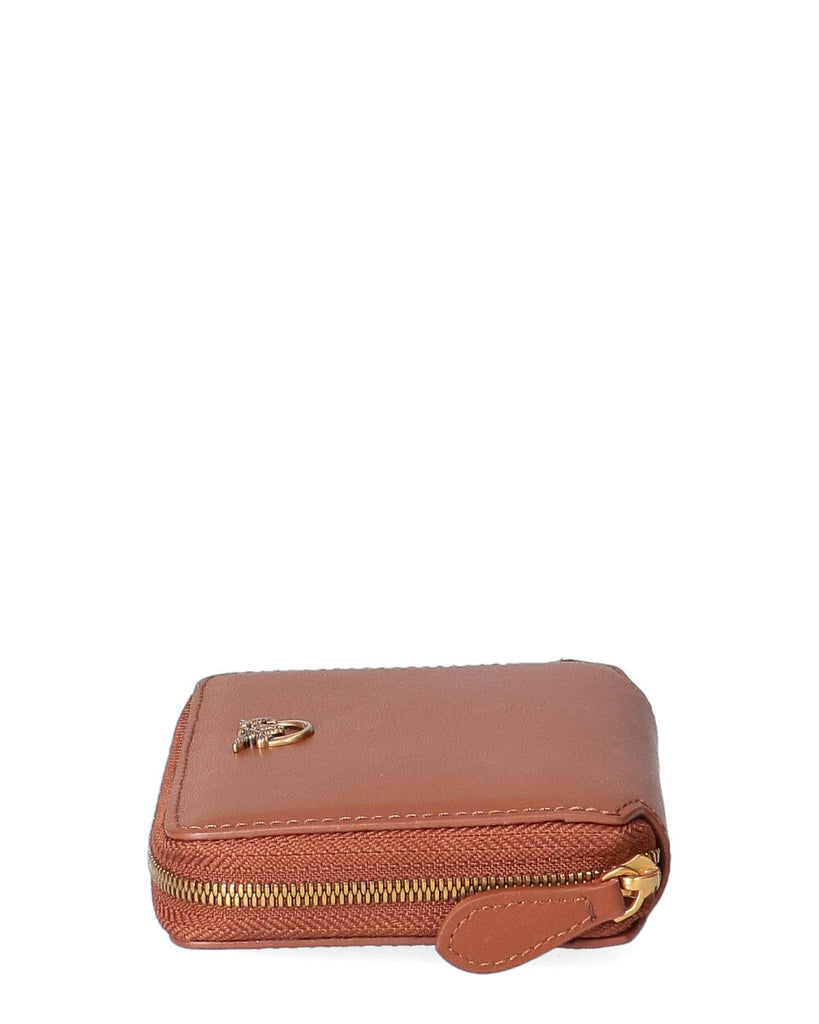 Portafoglio zip-around di forma quadrata in morbida pelle mano seta, personalizzato con placchetta Love Birds Diamond Cut su base in pelle. L'interno è foderato in polycotton. Chiusura con zip. Dimensioni : 11*13*3 cm
