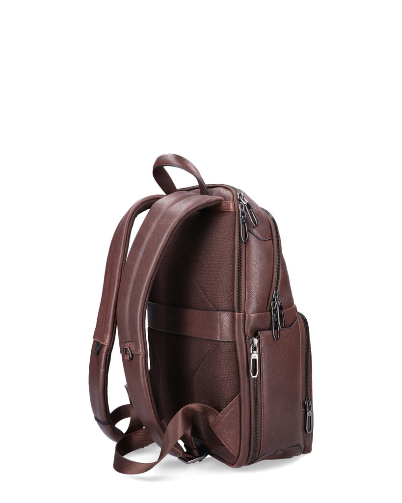 Zaino uomo realizzato in pelle con scomparto porta Pc 14,". Doppio scomparto chiuso con zip. Protezioni antiurto e anti frode RFID. Tasca porta ombrello. Tasca per AirPods. Sistema di aggancio al trolley con cordella. Sistema dorsale a contatto con il corpo, imbottito e traspirante. Spallacci regolabili. Dimensioni : 39 x 28 x 15 cm