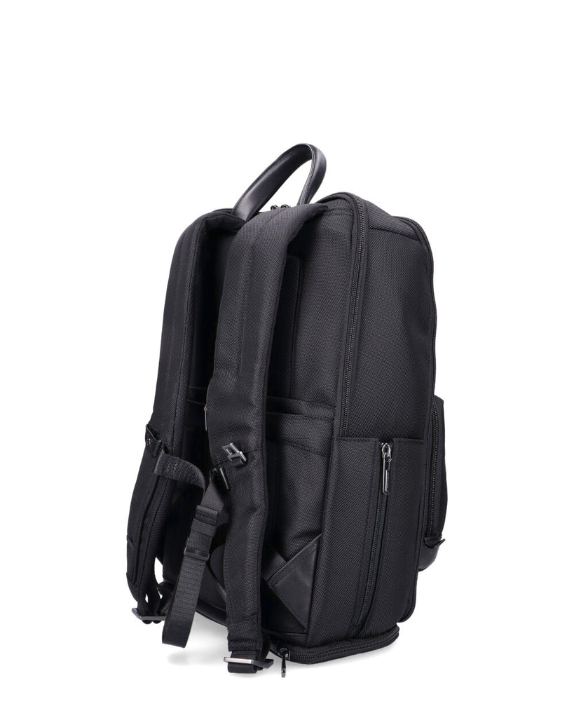 Zaino da viaggio Piquadro con scomparto porta pc da 15 pollici, realizzato in pelle e tessuto riciclato dimensioni 29x44x20 cm chiusura con zip manico superiore spallacci regolabili fodera interna organizzatori interni cinghia sternale vano portascarpe protezione RFID realizzato in tessuto riciclato dettagli in pelle
