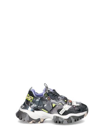 Sneaker multimateriale in tessuto, pelle stampata, cavallino e tessuto pailletes. Accessorio in TPU ed etichette in tessuto applicate. Fodera tessuto. Suola in gomma outdoor con inserto effetto metallico posteriore. Altezza suola 30. Plantare estraibile.