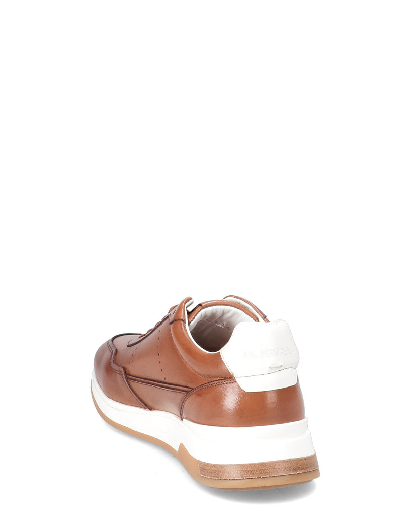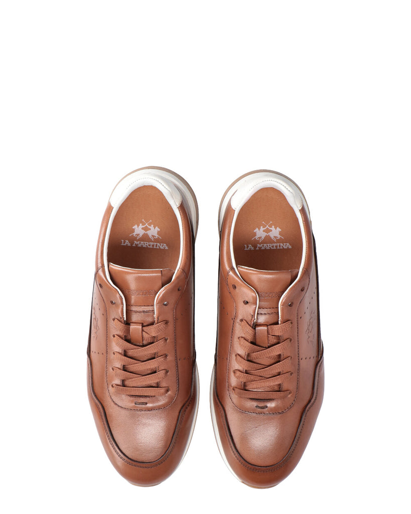 Interamente in pelle Logo La Martina in alta frequenza Impunture artigianali a mano Suola bicolore con tecnologia bi-densità Traforature che delimitano il profilo intorno al logo in rilievo sul lato Fusbett personalizzato per comfort e supporto ottimali