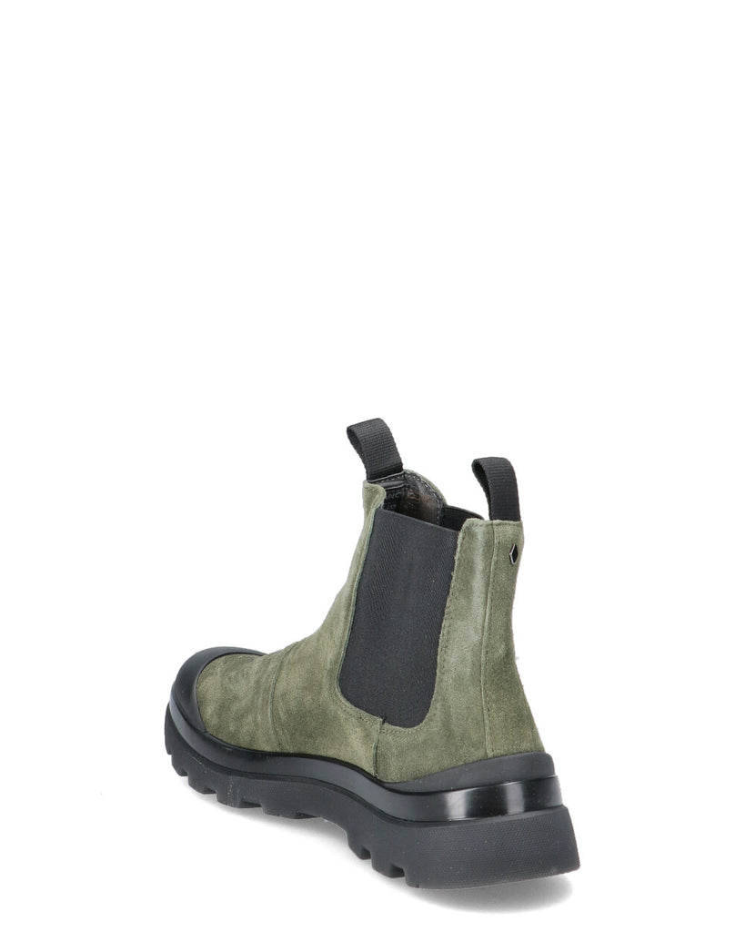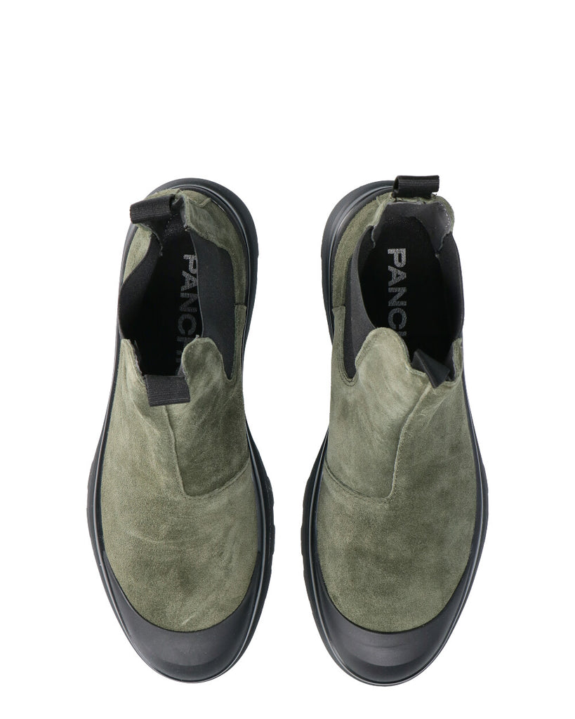Stivaletti Beatle uomo P03 con tomaia in suede verde militare, foderati in microfibra. Suola di 2,5 cm dal design a forma di "guscio" ed elastici laterali neri. La linea P03 è estremamente protettiva con un gusto tecno-cool a prova di globe-trotter.