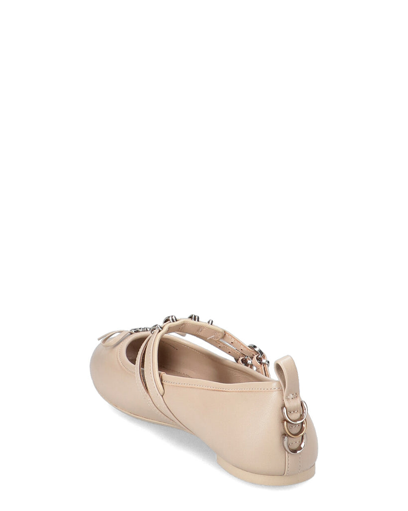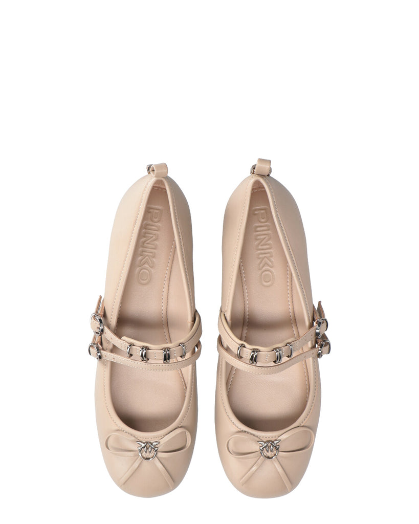 Classiche scarpe ballerine, contraddistinte dalla suola piatta in gomma, realizzate in morbida nappa e personalizzate con doppio cinturino regolabile sul collo del piede e fiocchetto che completa il design dalla punta stondata, reso ancora più unico dal logo uccellini Love Birds Diamond Cut in metallo. I cinturini e il dettaglio sul tallone sono personalizzati con inserti e anelle in metallo che aggiungono un tocco bold allo stile classico e femminile di questa calzatura da donna. La fodera e la soletta interna delle ballerine sono realizzate in cuoio, e il sottopiede presenta un'imbottitura di 4mm che garantisce il massimo comfort.
