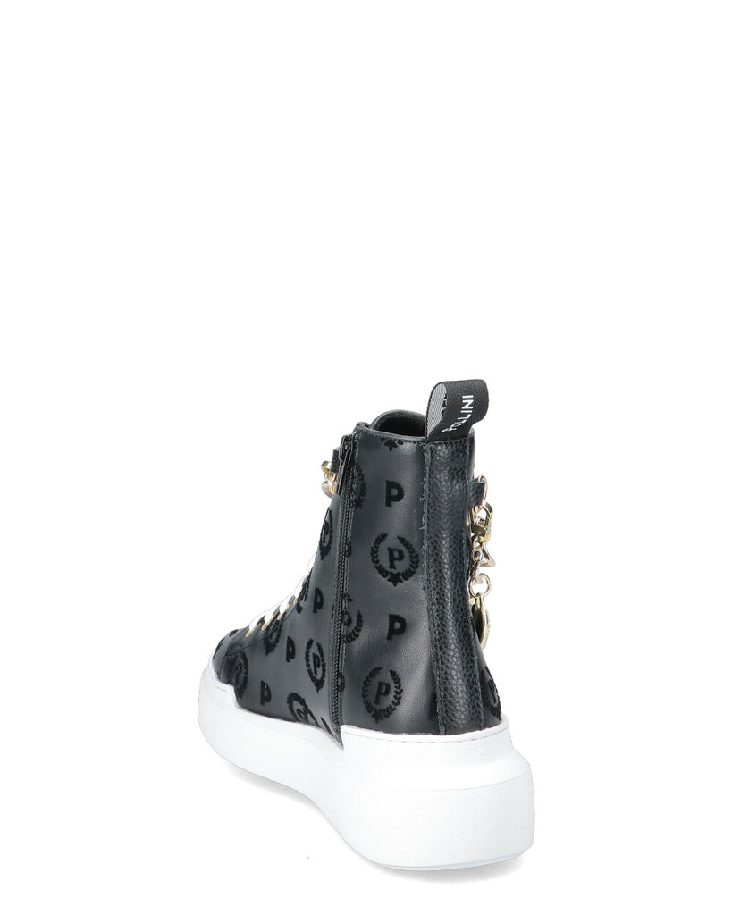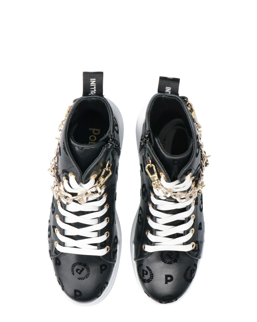 Stampa floccata Articolo continuativo non soggetto a promozioni Catena amovibile con pendenti in metallo Chiusura con lacci Chiusura laterale con zip Loop posteriore per agevolare la calzata Fondo voluminoso in gomma Tacco: 45 MM Fondo: Gomma