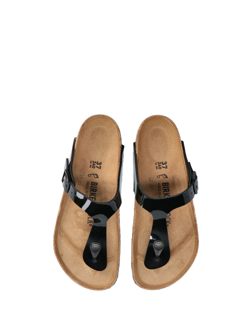Plantare anatomico in sughero e lattice Tomaia: Birko-Flor® con finitura laccata Sottopiede: pelle scamosciata Suola: EVA Dettagli: infradito con una fibbia ad ardiglione in metallo regolabile individualmente “Made in Germany” Calzata regolare
