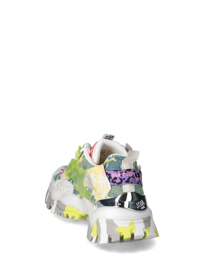 Sneaker multimateriale pelle stampata, cavallino e tessuto con rete, accessorio in pvc ed etichette in tessuto applicate. Fodera tessuto. Suola in gomma outdoor con inserto effetto metallico posteriore. Altezza suola 30. Plantare estraibile