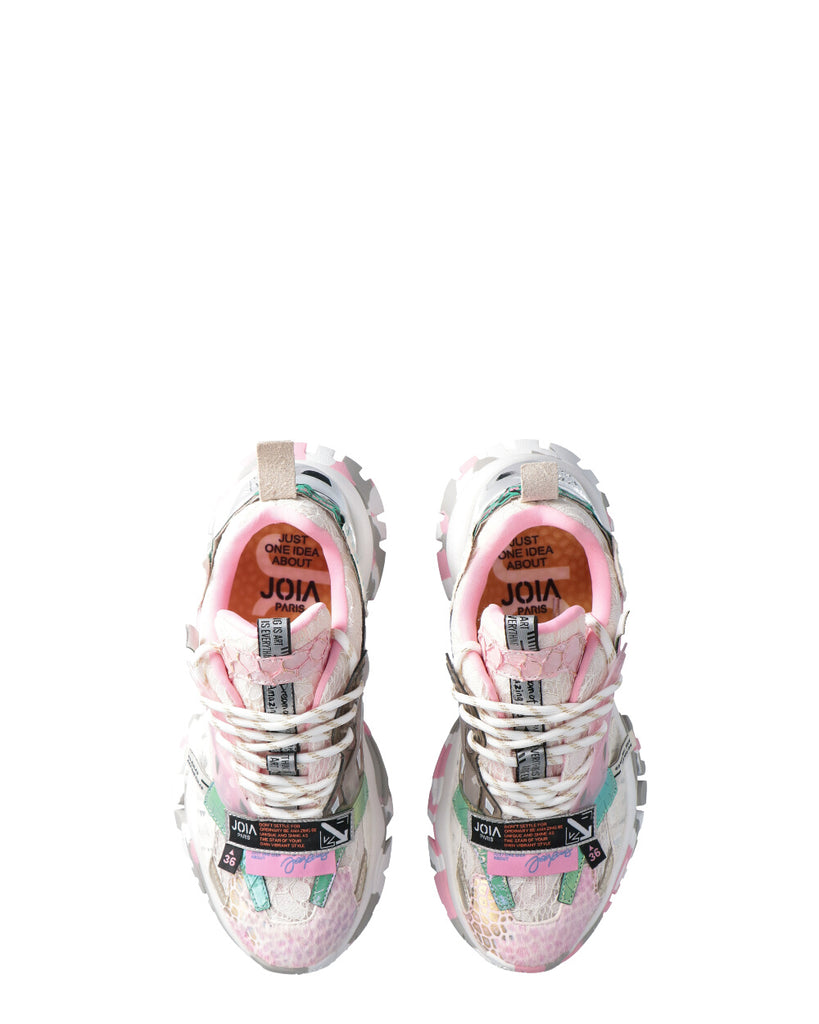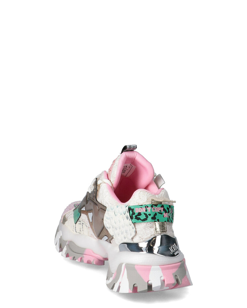 Sneaker multimateriale pelle stampata, cavallino e tessuto con rete, accessorio in pvc ed etichette in tessuto applicate. Fodera tessuto. Suola in gomma outdoor con inserto effetto metallico posteriore. Altezza suola 30. Plantare estraibile