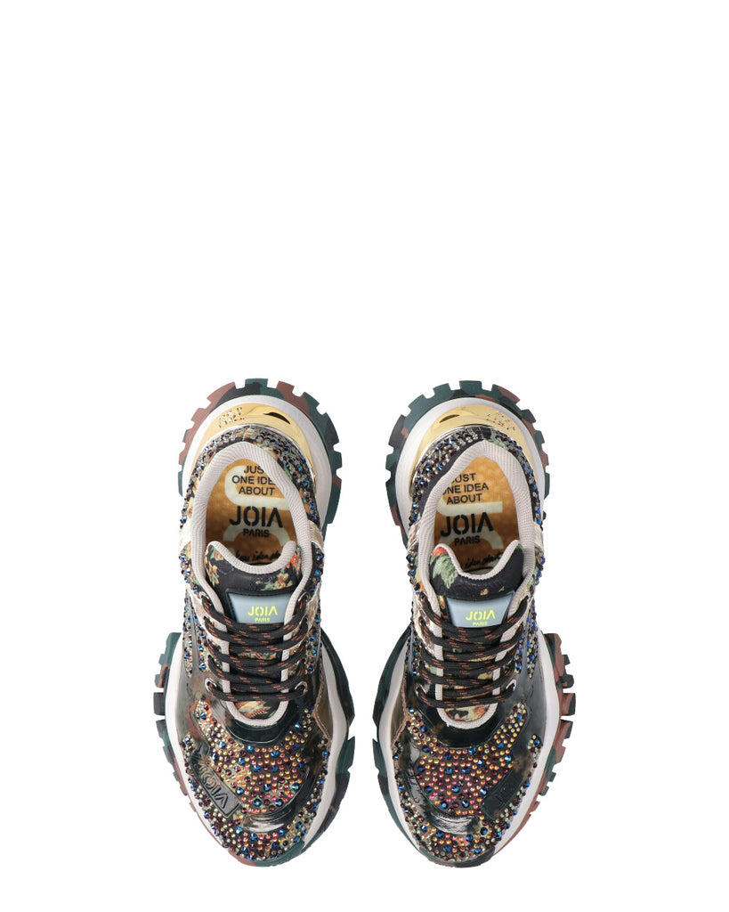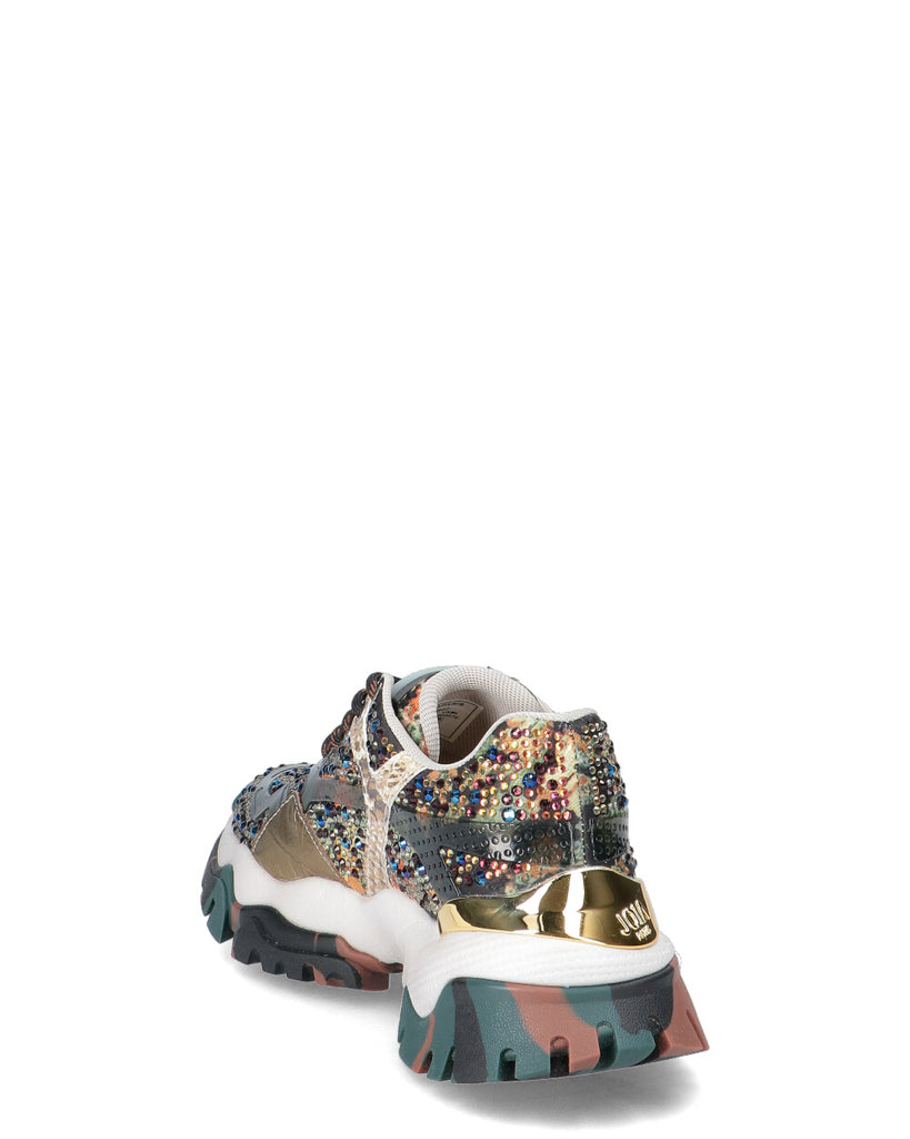 Sneaker in tessuto con applicazioni multistrass, inserti in TPU e pelle stampata. Fodera tessuto. Suola in gomma outdoor con inserto effetto metallico posteriore. Altezza suola 3 cm . Plantare estraibile.