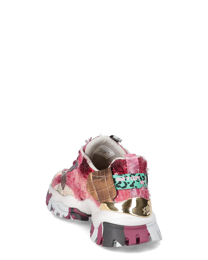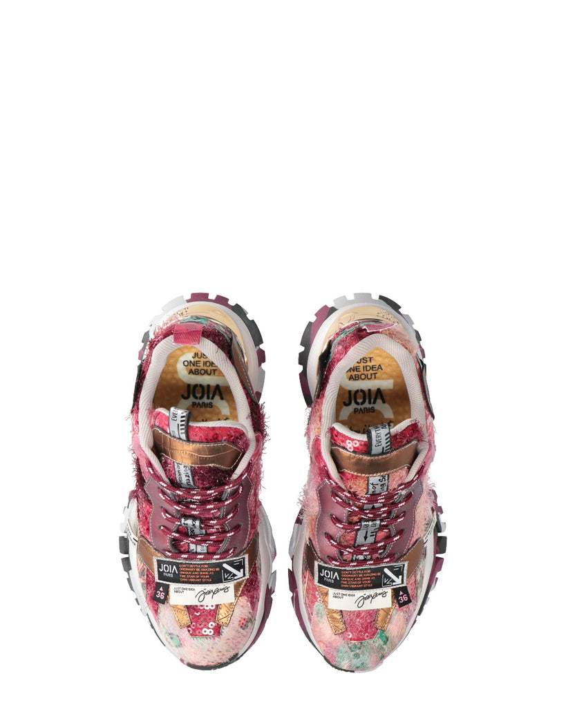 Sneaker multimateriale in tessuto, pelle stampata, cavallino e tessuto pailletes. Accessorio in TPU ed etichette in tessuto applicate. Fodera tessuto. Suola in gomma outdoor con inserto effetto metallico posteriore. Altezza suola 3 cm . Plantare estraibile