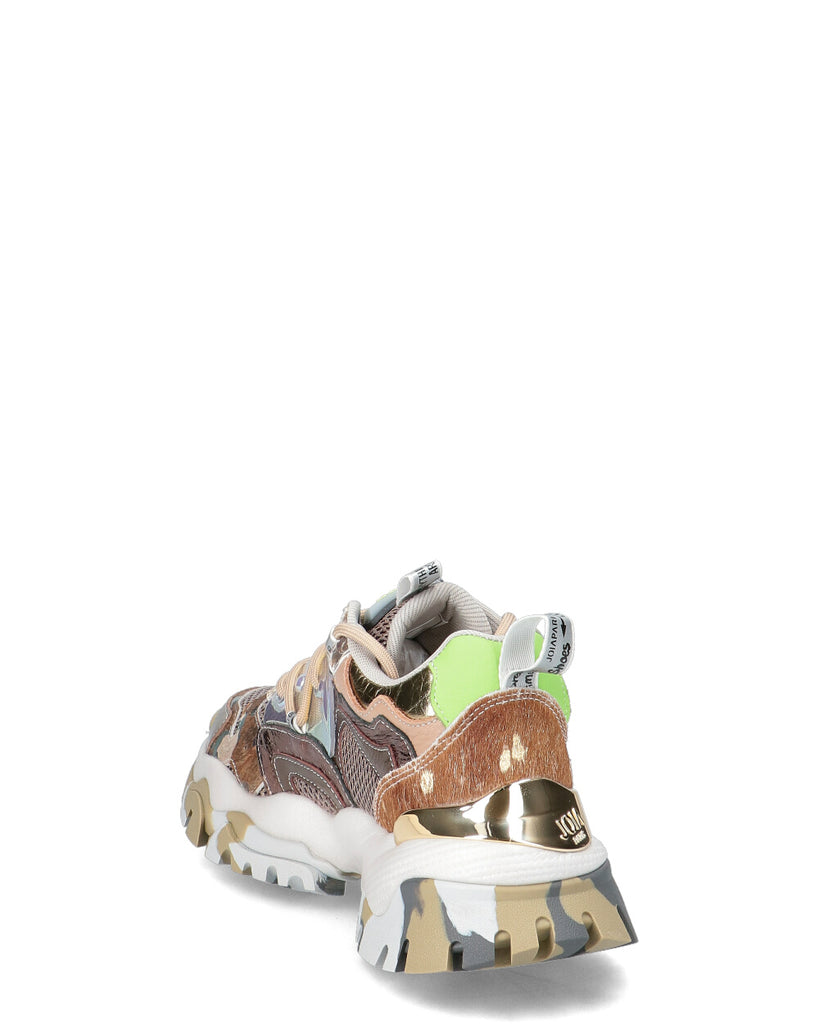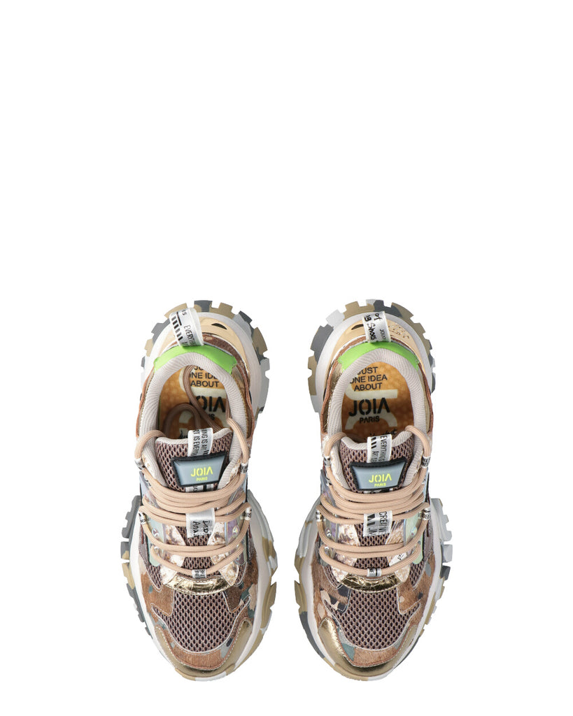 Sneakers di Joya Paris multimateriale pelle stampata e tessuto con rete, accessorio in TPU ed etichette in tessuto applicate. Chiusura con lacci. Suola in gomma outdoor con inserto effetto metallico posteriore. Plantare estraibile. Fodera tessuto. Tacco: 3 cm
