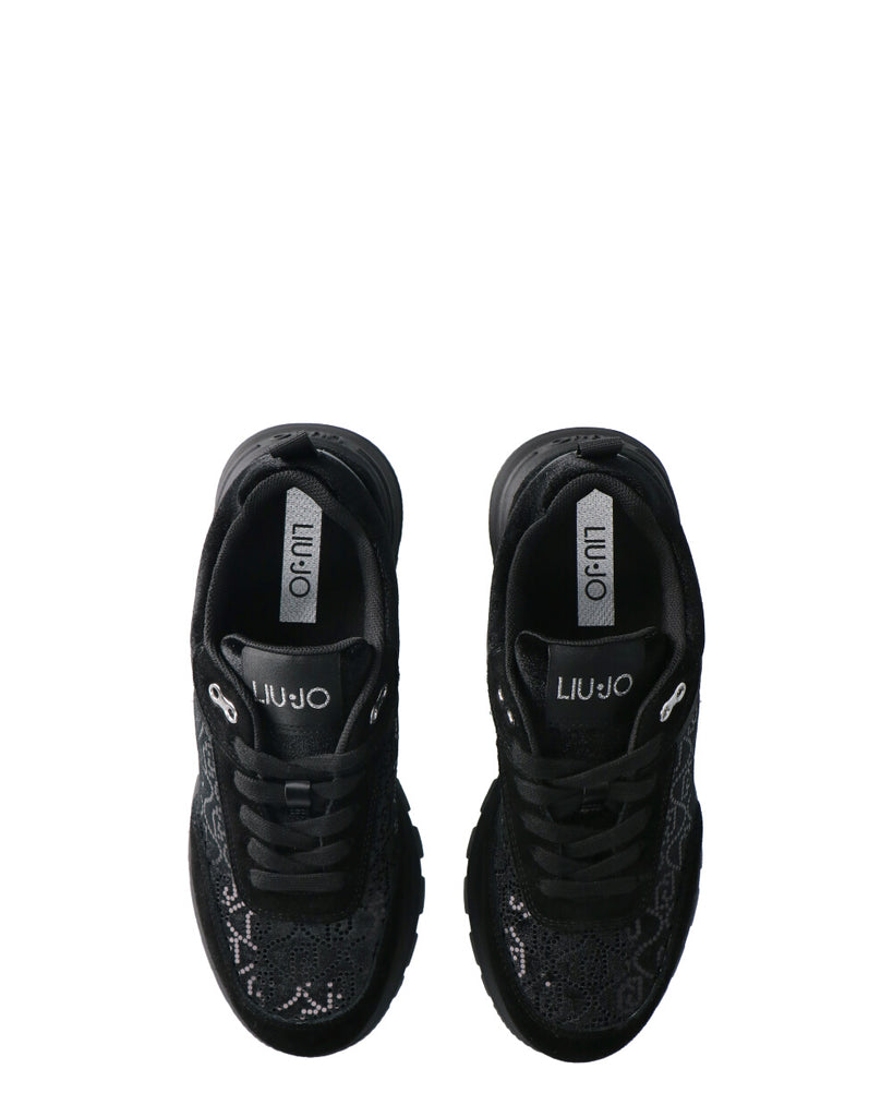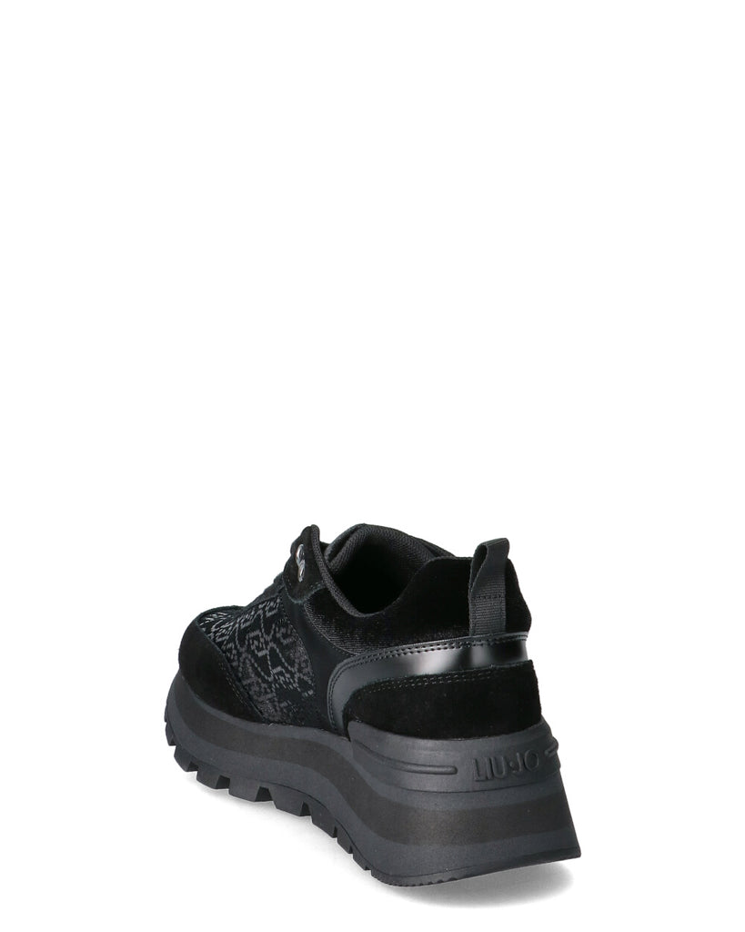 Sneakers nere in suede con raso e velluto Stampa monogram con micro paillettes Etichetta logo jacquard Lacci piatti Suola platform con leggero bicolor Spoiler posteriore con logo Battistrada dentellato Altezza suola: 5 cm