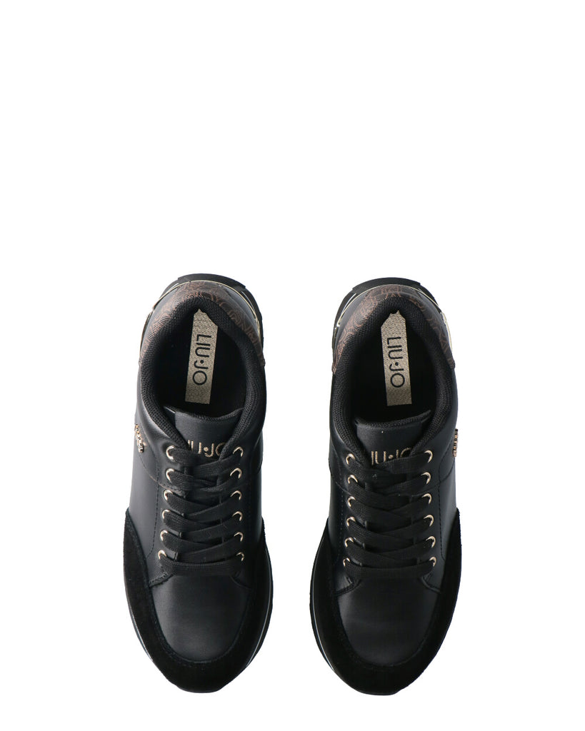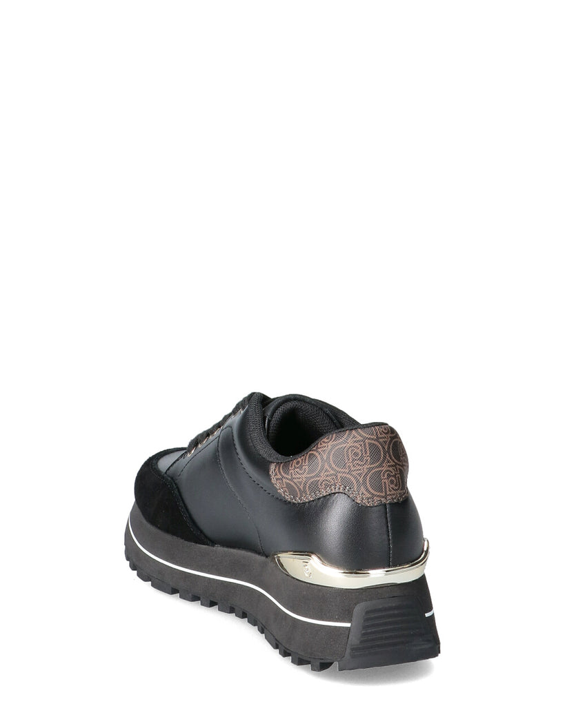 Sneakers nera donna con tomaia in pelle Inserti in suede e stampa monogram Etichetta con logo jacquard Logo lettering in metallo Spoiler metallico Lacci piatti Suola platform con logo Battistrada dentellato in gomma Altezza suola: 4,5 cm