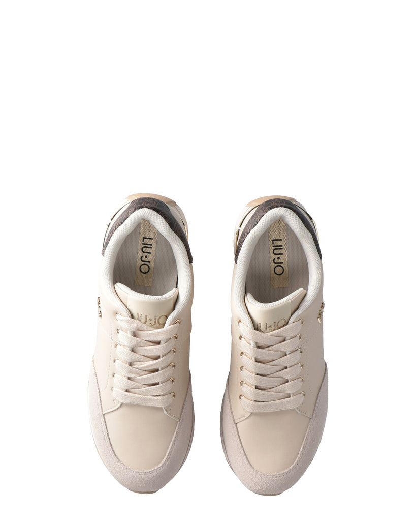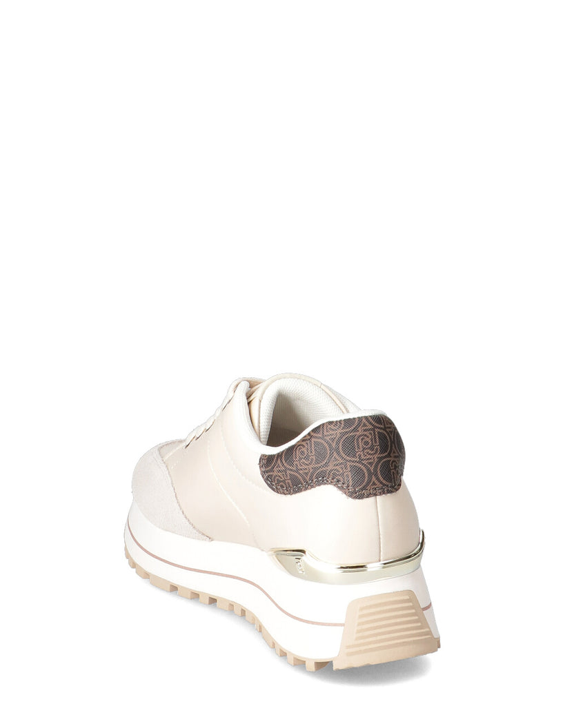 Sneakers beige donna con tomaia in pelle Inserti in suede e stampa monogram Etichetta con logo jacquard Logo lettering in metallo Spoiler metallico Lacci piatti Suola platform con logo Battistrada dentellato in gomma Altezza suola: 4,5 cm