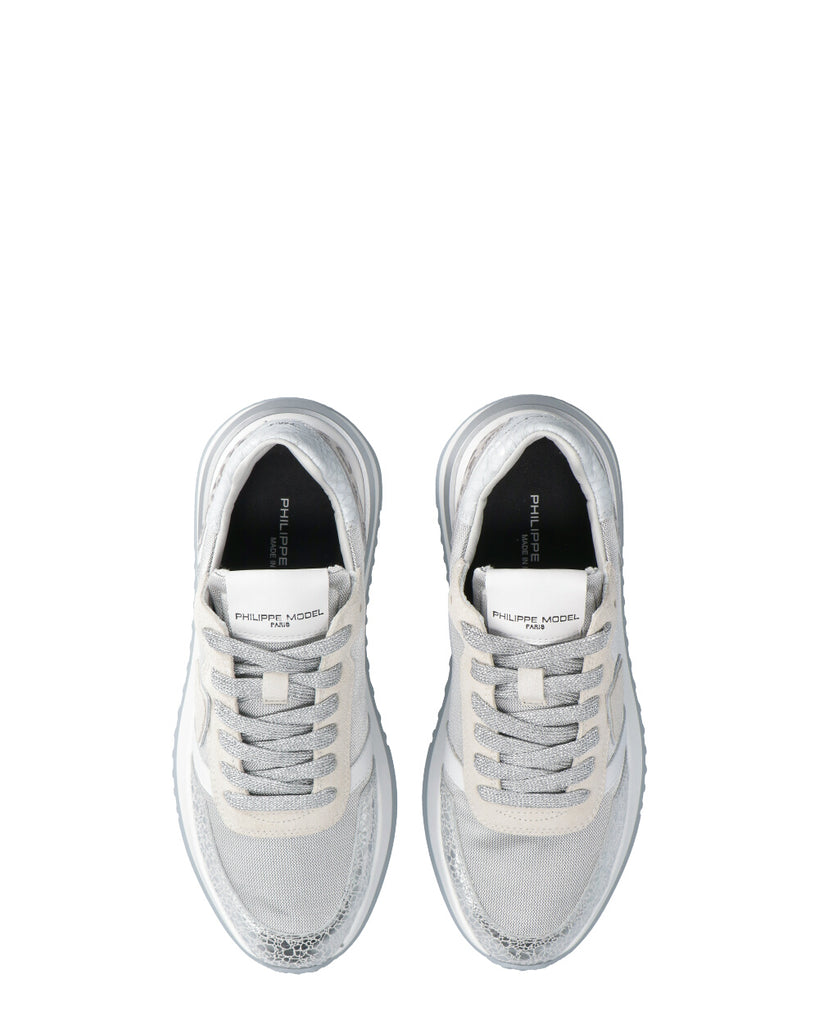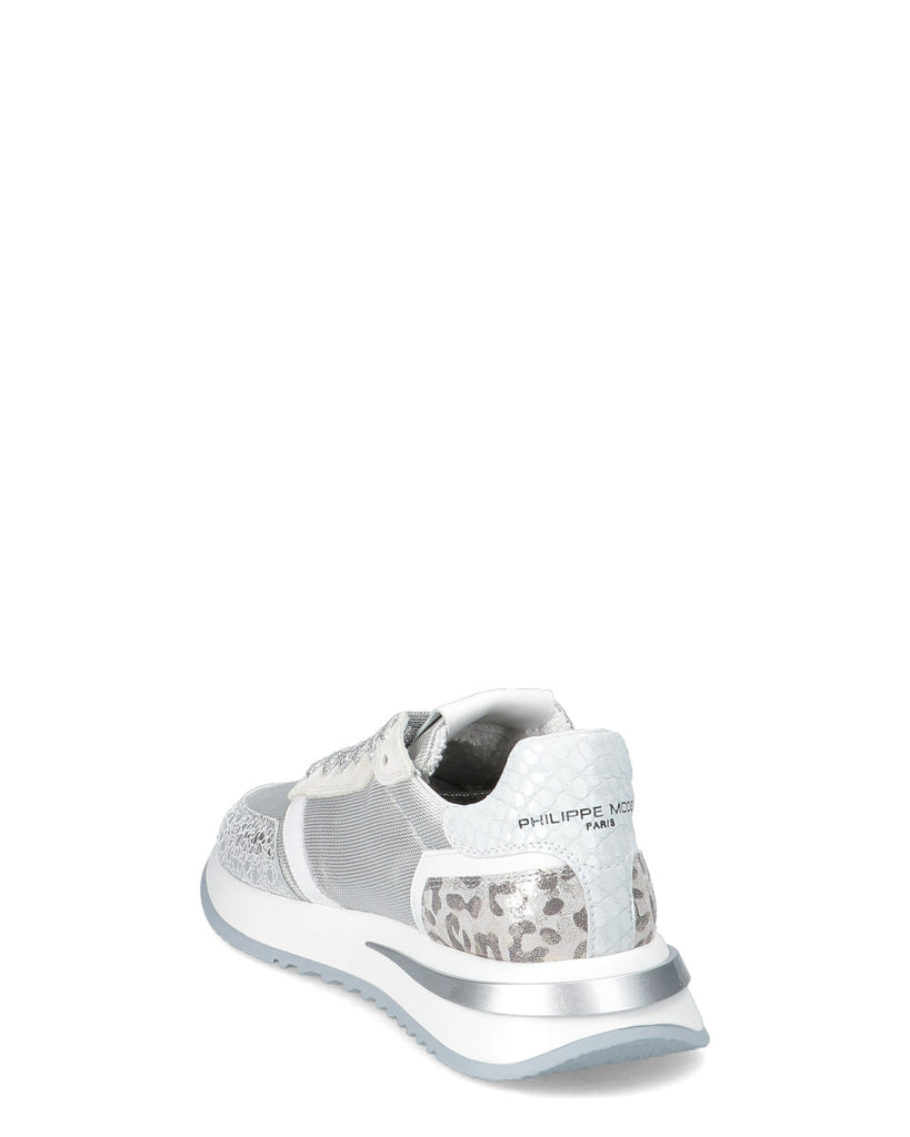 Sneaker in mesh pelle argentati, con spoiler stampato rettile tallone animalier. Fodera in spugna di cotone traspirante, con soletto interno imbottito estraibile. Fondo in gomma microporosa con inserto tridimensionale. Altezza al tallone: 3 cm. Altezza fondo 3,5 cm