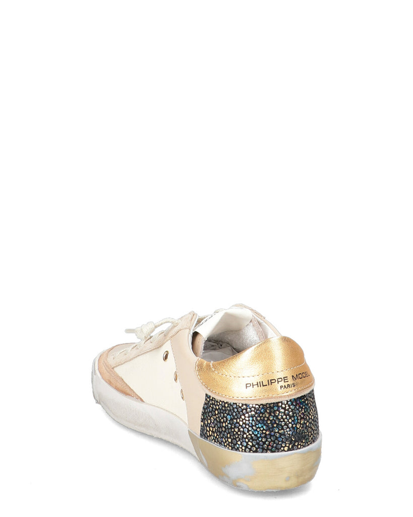 Sneaker in vitello e suede, con dettagli glitter e oro. Soletta interna imbottita ed estraibile, fodera traspirante in spugna di cotone. Fasciatura rifinita artigianalmente, con fresature e dettagli argentati, suola in gomma. Suola: 2.5 CM