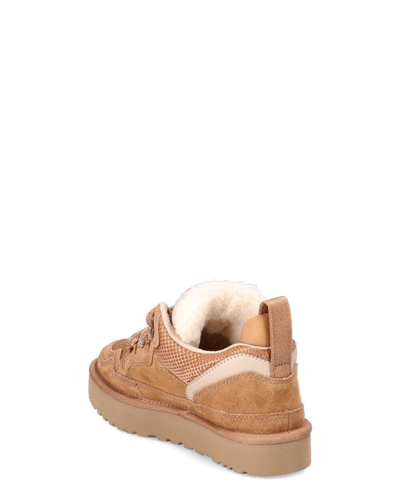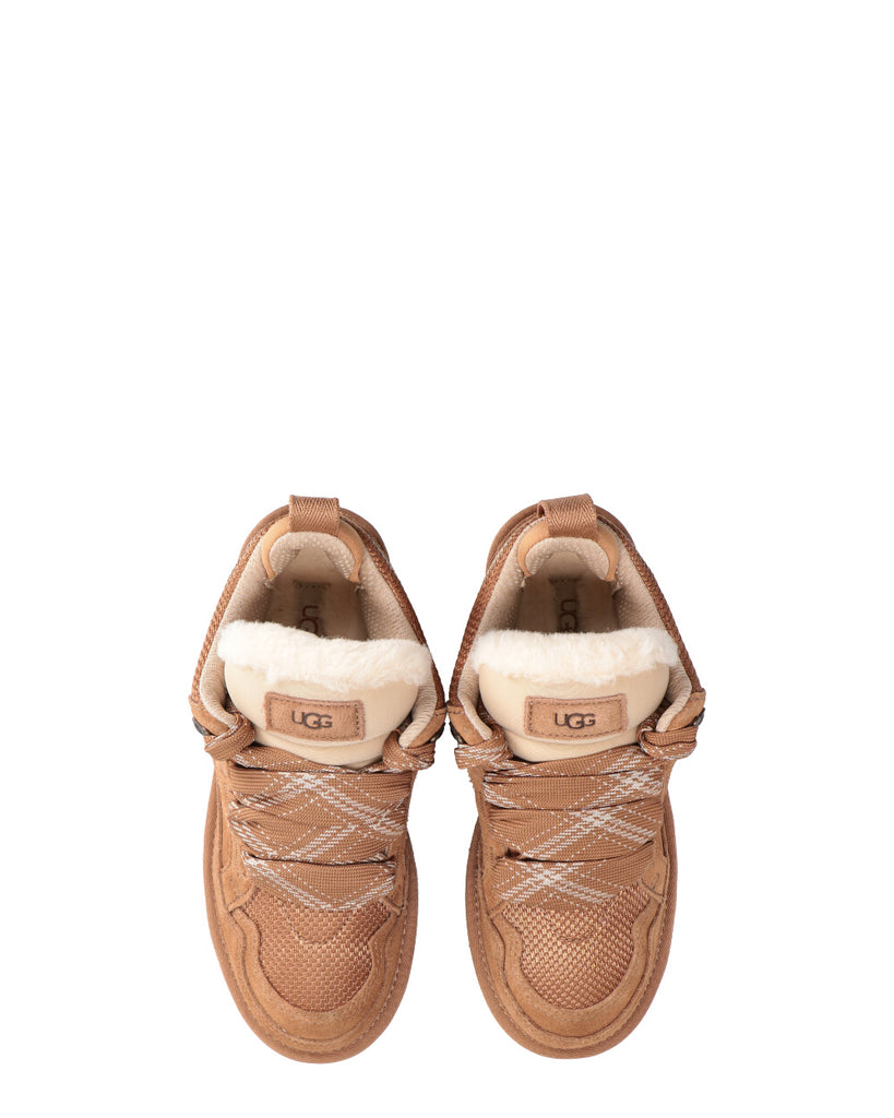Tomaia in rete di tela intrecciata riciclata e camoscio, cinturino sul tallone in tessuto resistente, applicazione con logo UGG®, collarino imbottito, linguetta oversize imbottita Lacci realizzati con fibre di poliestere riciclato UNIFI (100%), laccio piatto bicolore Fodera in mesh di poliestere, realizzata con poliestere modificato da carbone di caffè (55%) e poliestere normale (45%), fodera in UGGplush™ (10 mm), realizzata con lana rigenerata (60%) e lyocell (40%) Soletta in UGGplush™ (10 mm), realizzata con lana rigenerata (60%) e lyocell TENCEL™ (40%) Suola interna in EVA Suola in EVA da canna da zucchero Logo UGG® in rilievo Paio di lacci extra incluso