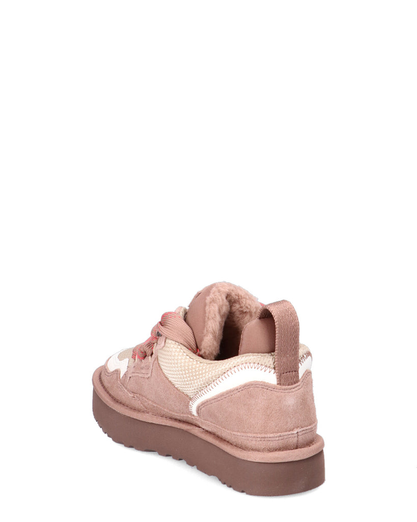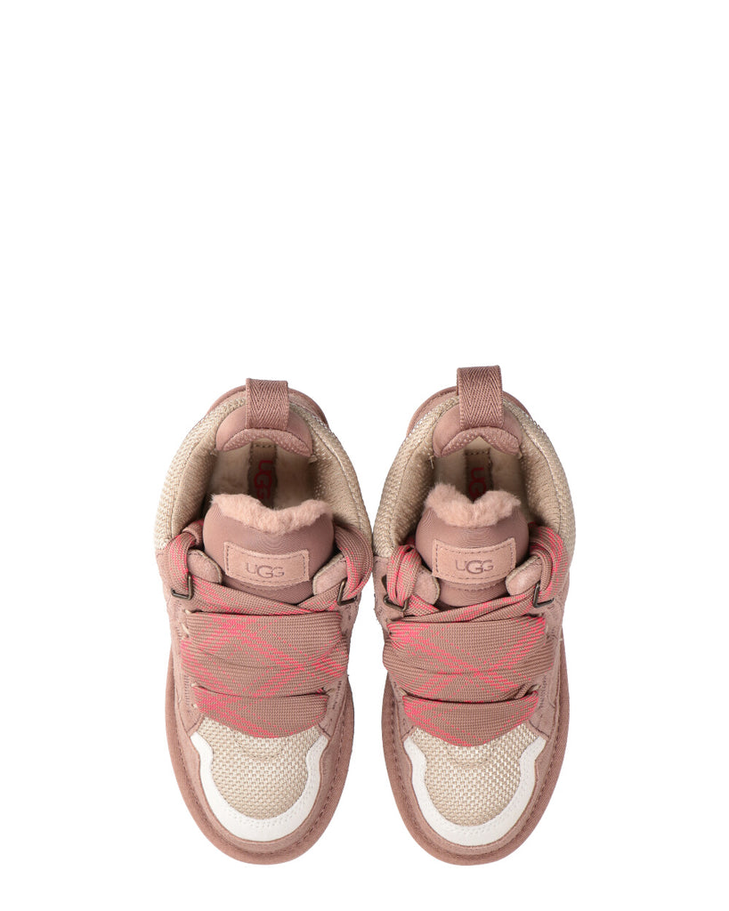 Tomaia in rete di tela intrecciata riciclata e camoscio, cinturino sul tallone in tessuto resistente, applicazione con logo UGG®, collarino imbottito, linguetta oversize imbottita Lacci realizzati con fibre di poliestere riciclato UNIFI (100%), laccio piatto bicolore Fodera in mesh di poliestere, realizzata con poliestere modificato da carbone di caffè (55%) e poliestere normale (45%), fodera in UGGplush™ (10 mm), realizzata con lana rigenerata (60%) e lyocell (40%) Soletta in UGGplush™ (10 mm), realizzata con lana rigenerata (60%) e lyocell TENCEL™ (40%) Suola interna in EVA Suola in EVA da canna da zucchero Logo UGG® in rilievo Paio di lacci extra incluso