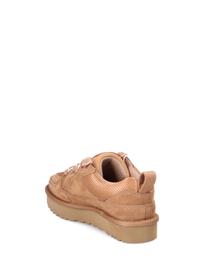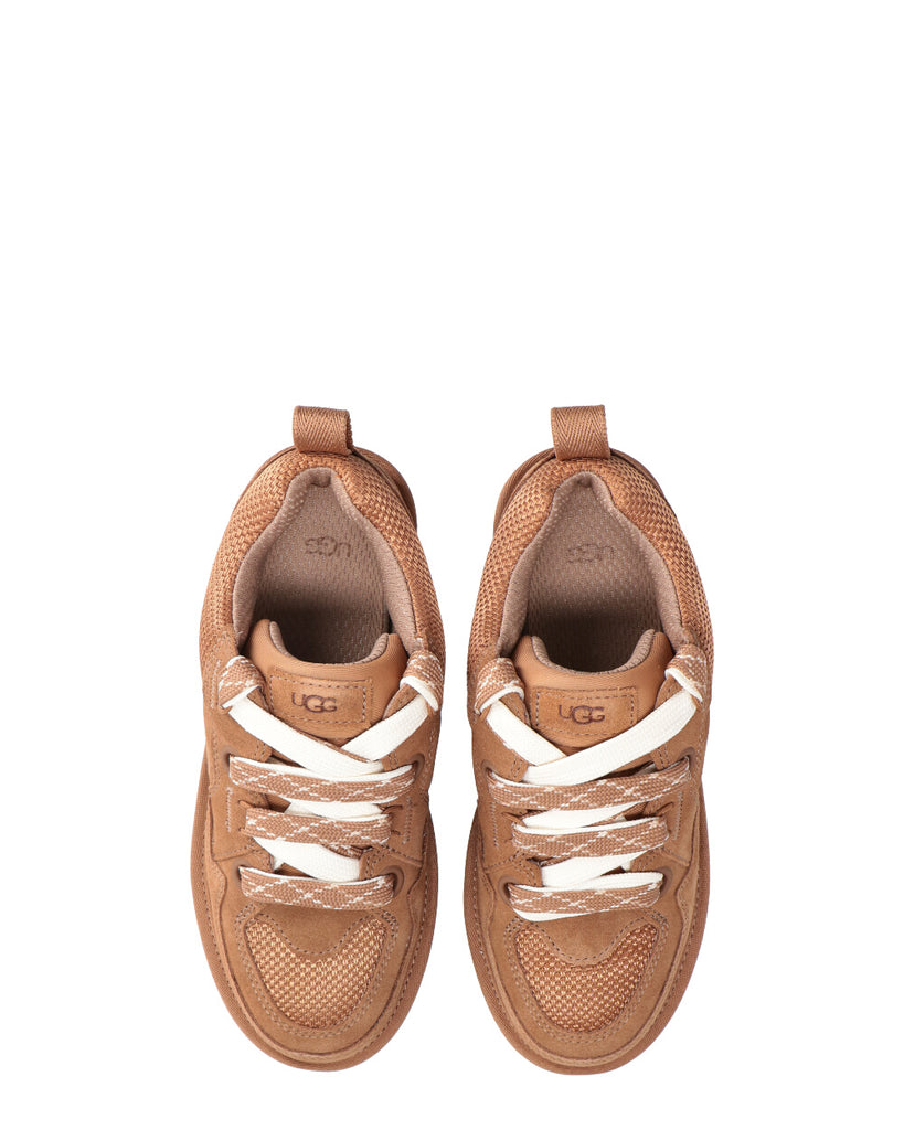 Tomaia in camoscio e rete di tela intrecciata riciclata, cinturino sul tallone in tessuto resistente, applicazione con logo UGG®, linguetta oversize imbottita Laccio piatto bicolore, sistema con doppia allacciatura Fodera in mesh di poliestere, realizzata con poliestere modificato da carbone di caffè (55%) e poliestere normale (45%) Suola interna in EVA Suola in EVA da canna da zucchero Logo UGG® in rilievo
