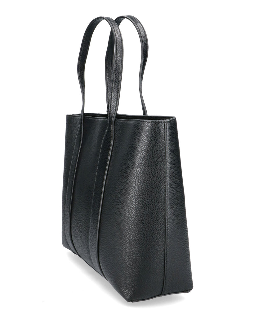 Shopper in ecopelle dotata di 3 tasche interne di cui 1 con zip, 3 fessure per carte di credito, lampo di chiusura e 2 manici. Dimensioni: 43*30*11 cm