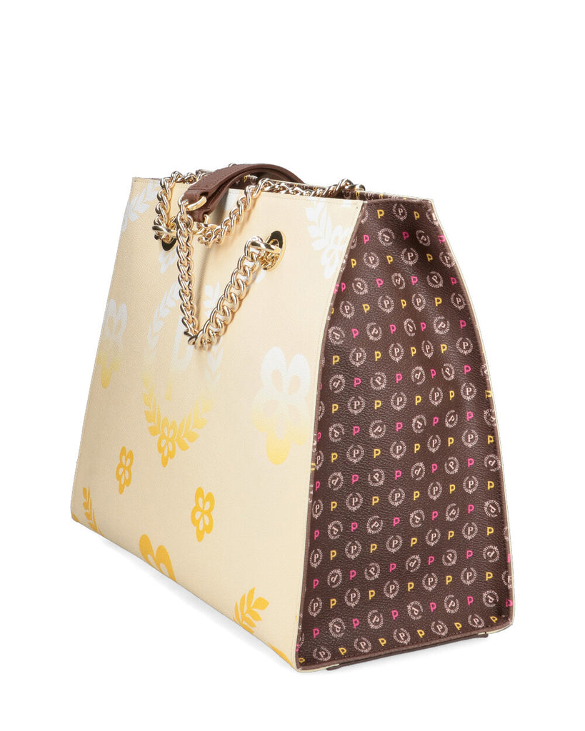 Manici spalla amovibili con catena e spallaccio Manici tubolari amovibili per portabilità a mano Stampa macro pattern Heritage Stampa maxi logo P-alloro sul quadrante frontale Chiusura con zip in testa Galvanica oro chiaro All'interno: tasca piatta con zip e doppia tasca aperta I doppi manici amovibili permettono alla borsa una doppia portabilità: a mano o a spalla. Dimensioni : 28*38*17 cm