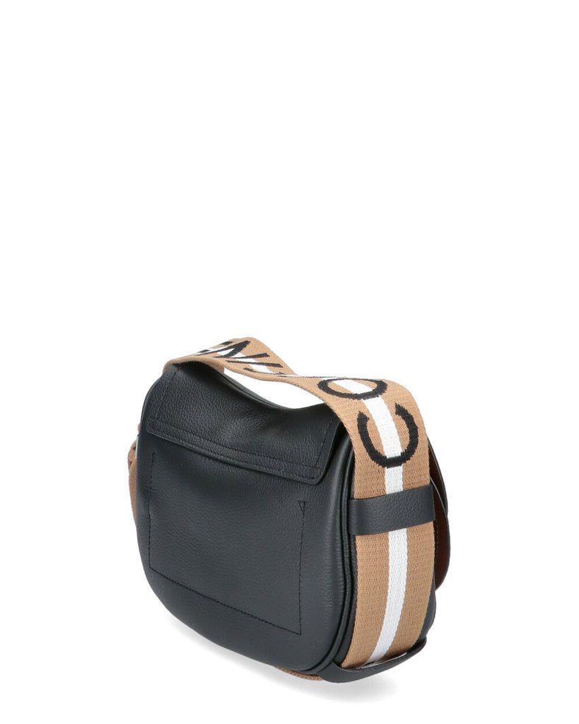 Portabilità a tracolla Pelle double Chiusura con zip Tracolla nastro regolabile Due tasche interne, di cui una con zip Galvanica oro chiaro Logo timbro oro Dimensioni 23x18x5 cm