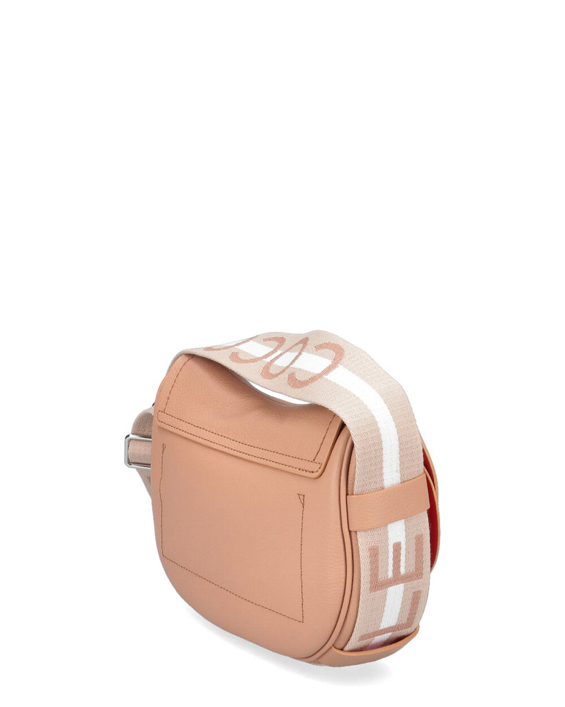 Portabilità a tracolla Pelle double Chiusura con zip Tracolla nastro regolabile Due tasche interne, di cui una con zip Galvanica oro chiaro Logo timbro oro Dimensioni 23x18x5 cm