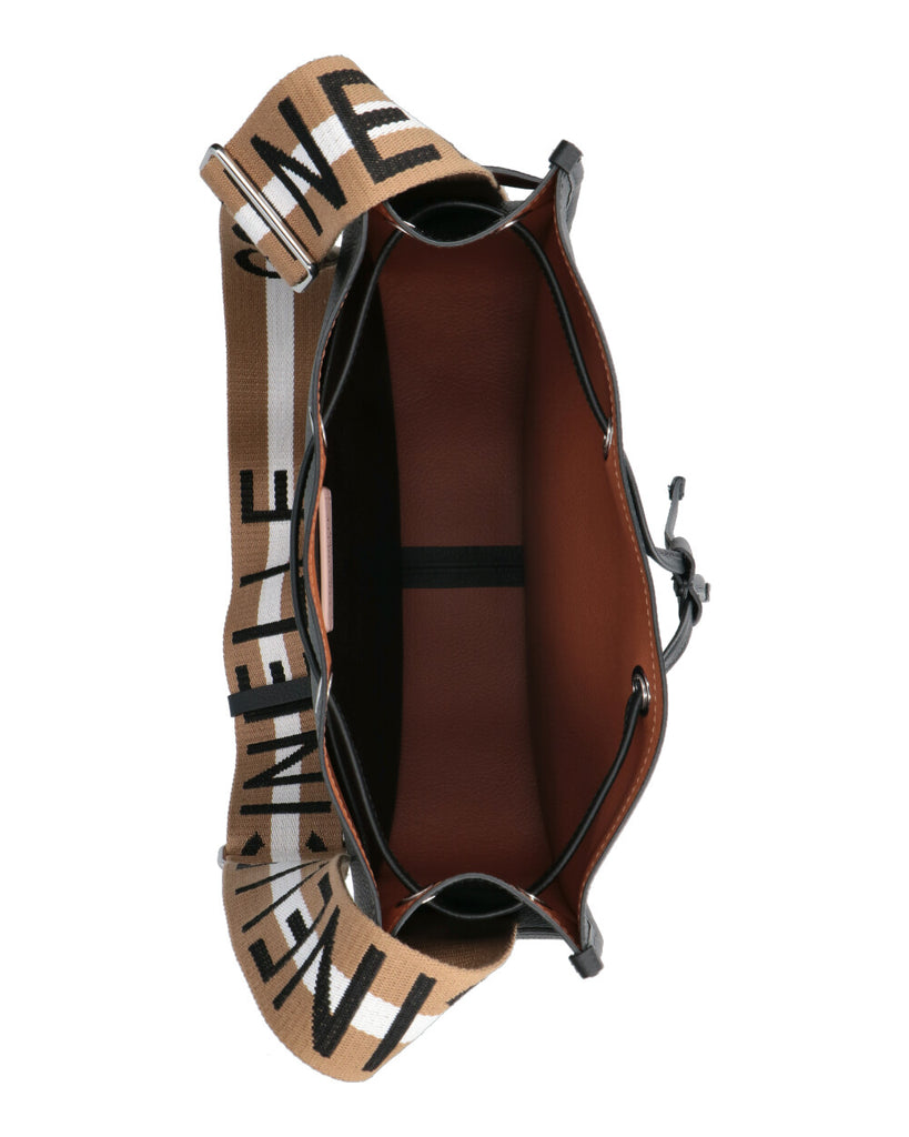 Portabilità a tracolla Pelle double Chiusura con coulisse Tracolla nastro regolabile Tasca interna Galvanica oro chiaro Logo timbro oro Dimensioni : 26*24*9 cm