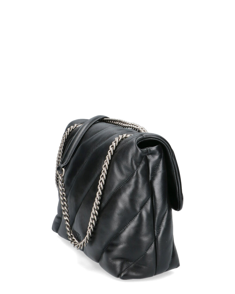 Big Love Bag Puff in morbida nappa con maxi trapuntatura obliqua. La chiusura è completata dall'iconica fibbia in metallo Love Birds Diamond Cut. L'interno è foderato in microfibra scamosciata e comprende tramezza chiusa con zip e tasca a parete. La tracolla combina la classica catena metallica rotonda al pratico spallaccio in nappa. Dimensioni: 24*32*11 cm