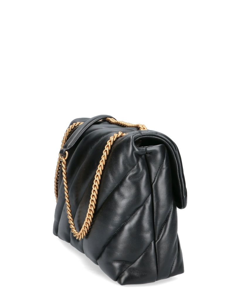 Big Love Bag Puff in morbida nappa con maxi trapuntatura obliqua. La chiusura è completata dall'iconica fibbia in metallo Love Birds Diamond Cut. L'interno è foderato in microfibra scamosciata e comprende tramezza chiusa con zip e tasca a parete. La tracolla combina la classica catena metallica rotonda al pratico spallaccio in nappa. Dimensioni: 24*32*11 cm
