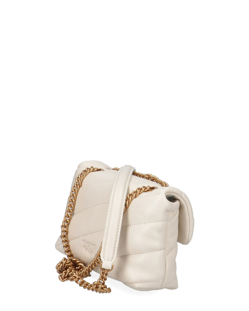 Baby Love Bag Puff in morbida nappa con maxi trapuntatura obliqua. La chiusura è completata dall'iconica fibbia in metallo Love Birds Diamond Cut, galvanica antique gold. L'interno è foderato in microfibra scamosciata e comprende tasca a parete chiusa con zip. Completa di tracolla sottile a catena in metallo. Dimensioni 12*18*7 cm