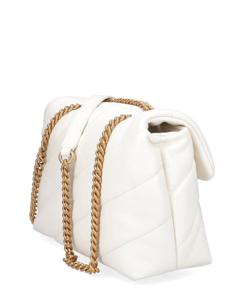 Classic Love Bag Puff in morbida nappa con maxi trapuntatura obliqua. La chiusura è completata dall'iconica fibbia in metallo Love Birds Diamond Cut. L'interno è foderato in microfibra scamosciata e comprende tramezza chiusa con zip e tasca a parete. La tracolla combina la classica catena metallica rotonda al pratico spallaccio in nappa. -Dimensioni : 18*27*11 cm (altezza-lunghezza-larghezza)