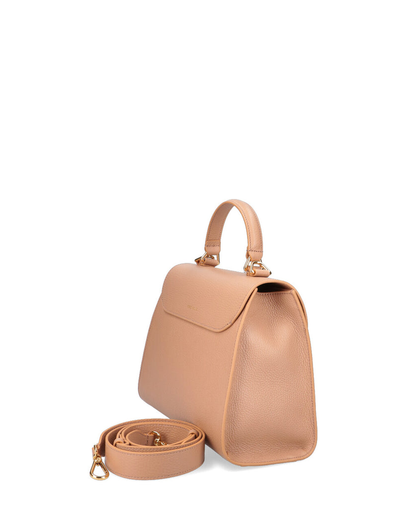 Portabilità a mano e a tracolla Pelle con grana Chiusura ad incastro Tracolla regolabile e removibile con gemelli Due tasche interne, di cui una chiusa con zip Galvanica gold Logo timbro oro Dimensioni : 29*21*13 cm