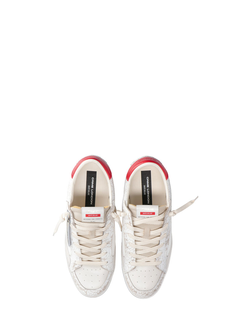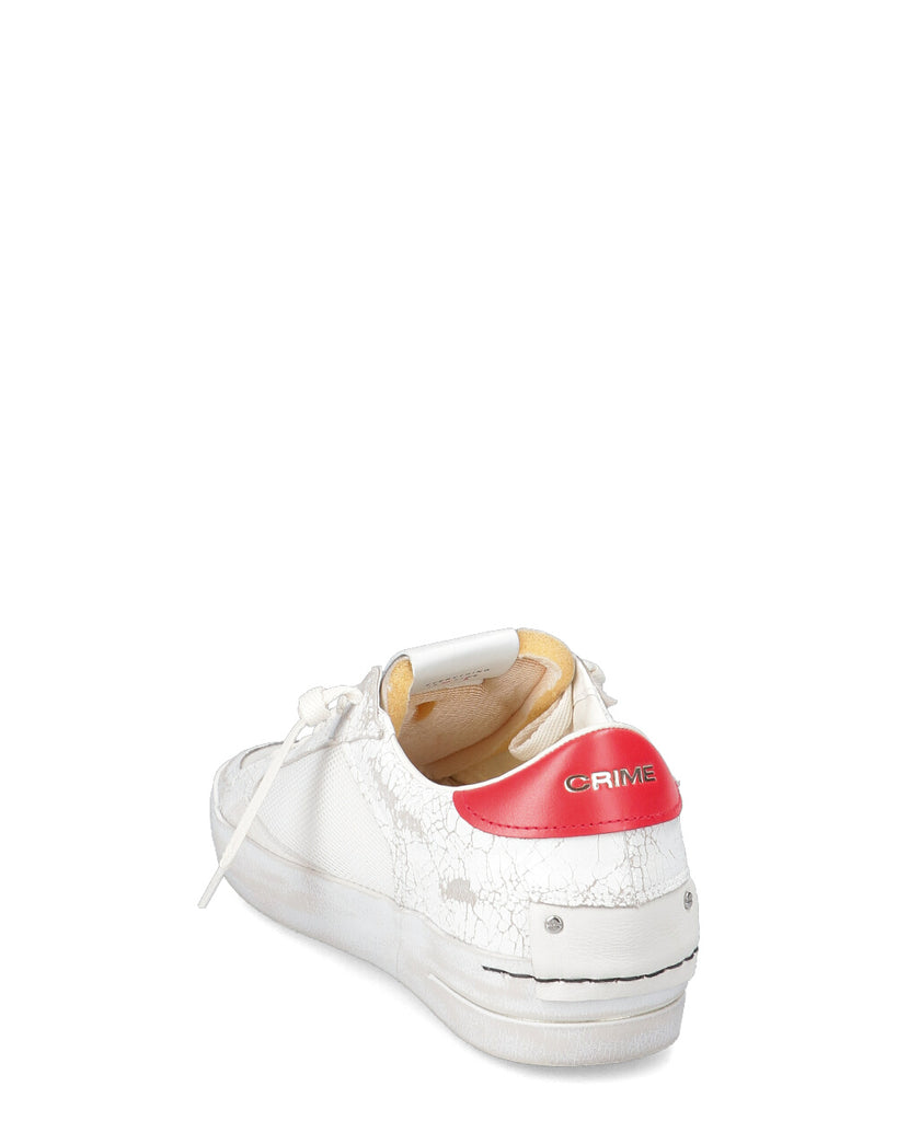 Sneaker realizzata con materiali di alta qualità Made in Italy Tomaia in cracklé e tessuto bianco, dettagli in suede crema Talloncino in pelle rossa Linguetta in tessuto crema con label logata in pelle Patch in pelle bianca sul retro Lacci marshmallow Unico tag in gomma specchiato argento Fodera in pelle e tessuto Suola in ecopelle fasciata ivory, fondo miele chiaro, alta 2.5