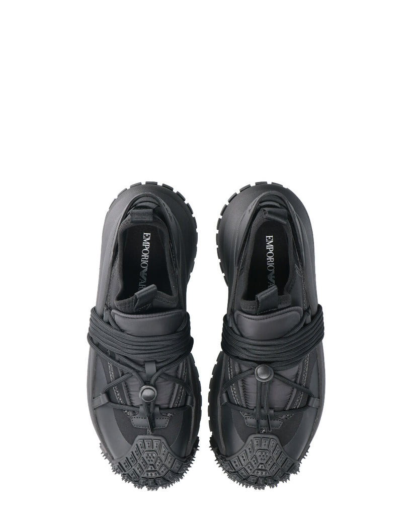 Tomaia in nylon e scuba Punta tonda Allacciatura con coulisse Tirante sul retro Suola in gomma