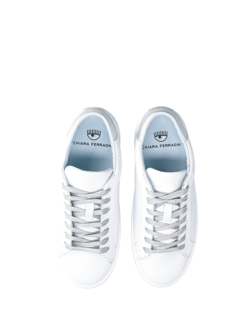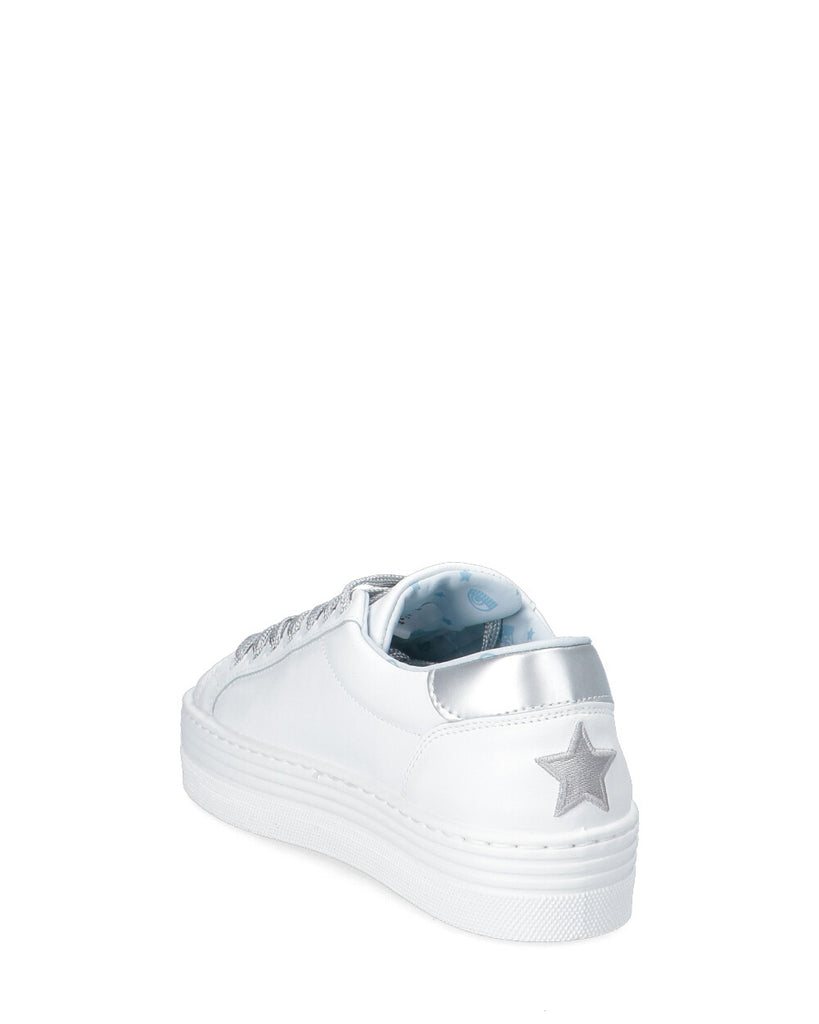 Sneakers platform Eyestar in pelle bianca con para 35 mm in gomma. Logo Eyestar argento sul retro. Suola interna e fodera in pelle azzurra