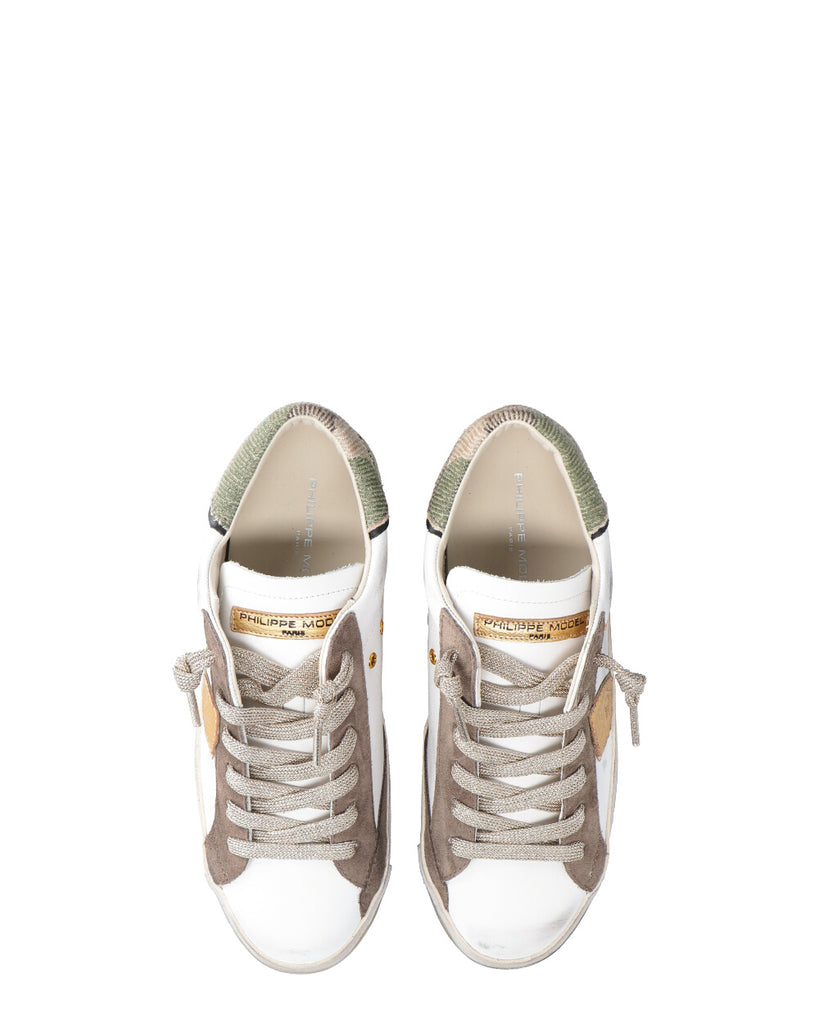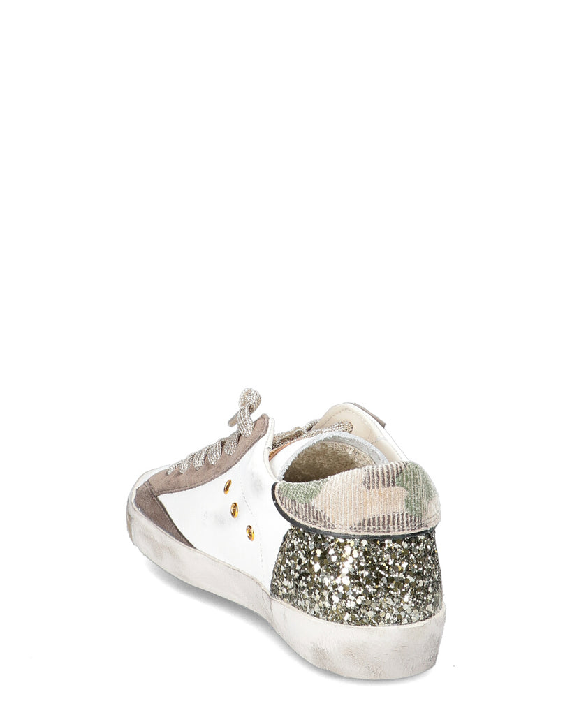 Sneaker in vitello e suede, con dettagli glitter e oro. Soletta interna imbottita ed estraibile, fodera traspirante in spugna di cotone. Fasciatura rifinita artigianalmente, con fresature e dettagli argentati, suola in gomma. Suola: 2.5 CM