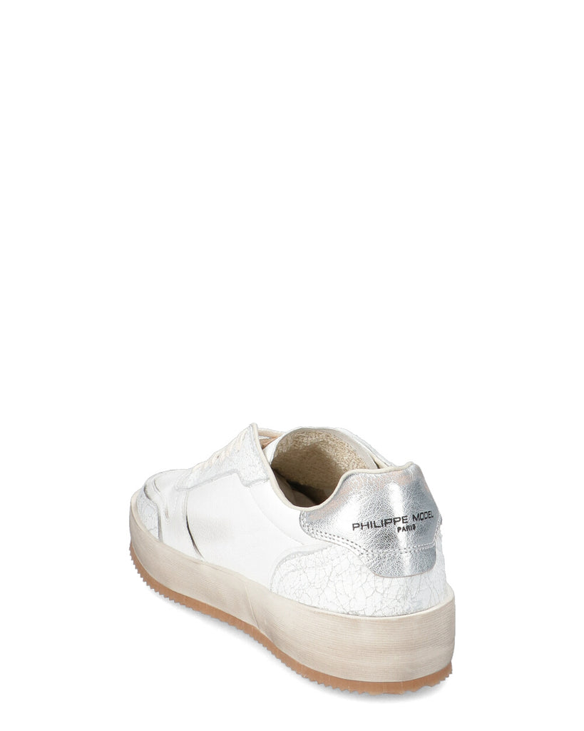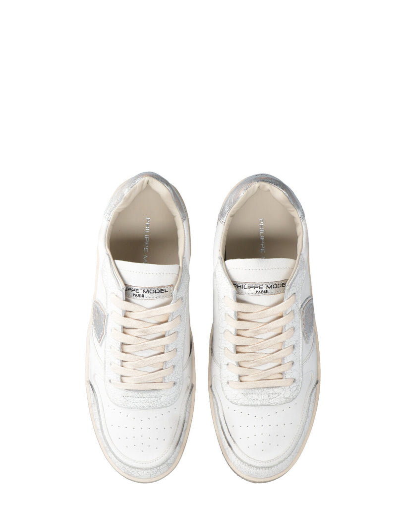 Sneaker in pelle di vitello con traforature sulla punta e logo argentato sul topponcino. Soletta interna in poliuretano espanso con rivestimento in pelle. Fodera in cotone spugnato e suola artigianale fasciata a mano. altezza fondo 4 cm