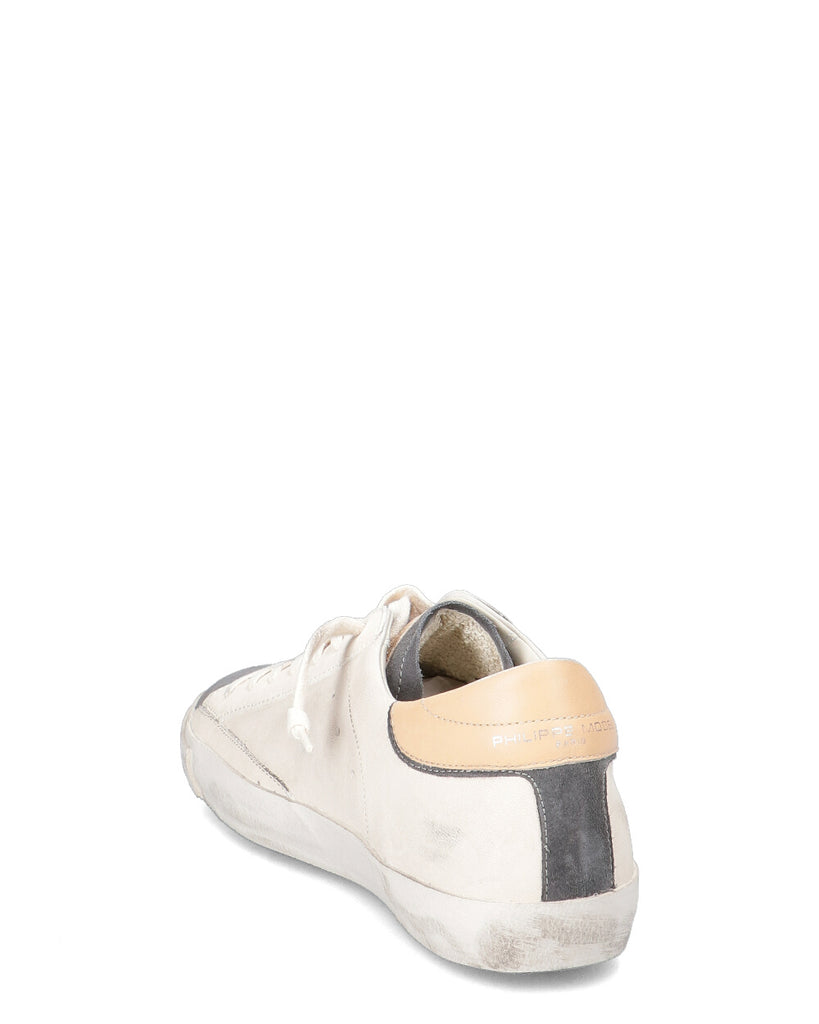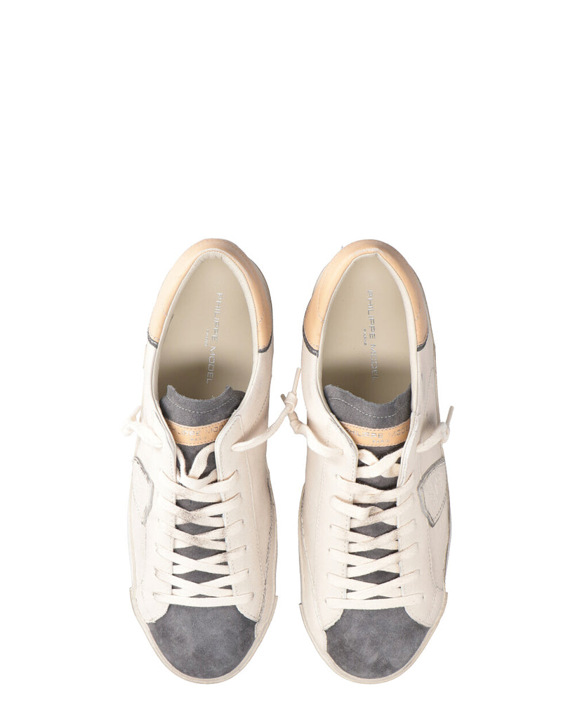 Sneaker bassa in pelle effetto used spoiler a contrasto in pelle lavata. Foderata internamente in spugna di cotone, ha soletta interna imbottita ed estraibile, suola in gomma fasciatura artigianale irregolare con sporcature. Altezza fondo 2.5 cm