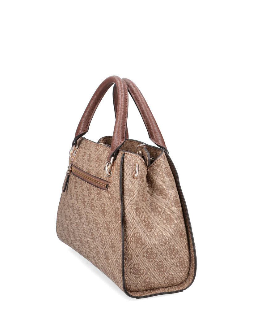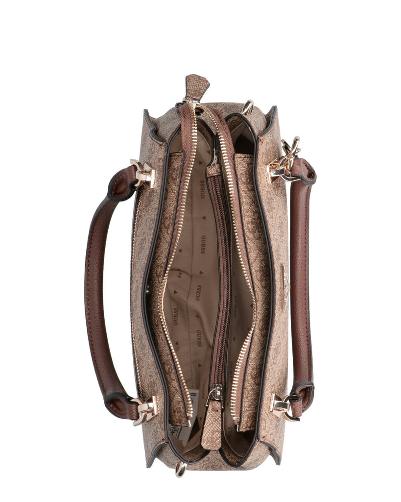 Esterno in simil pelle. Chiusura con cerniera lampo. Metalleria color oro pallido. Misure 31x21x12 cm. Due manici lunghezza ca. 35 cm. Tracolla regolabile e removibile lunghezza ca. 110/130 cm.